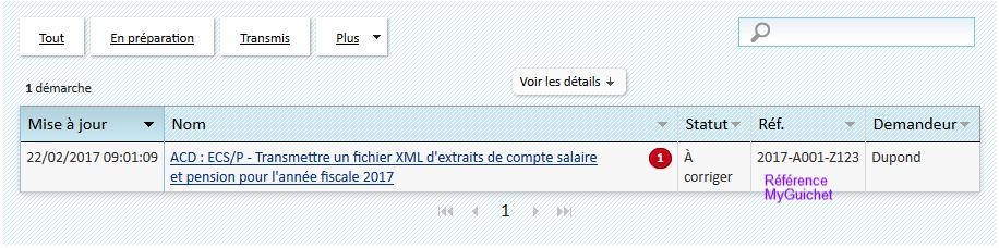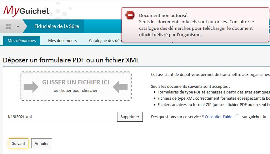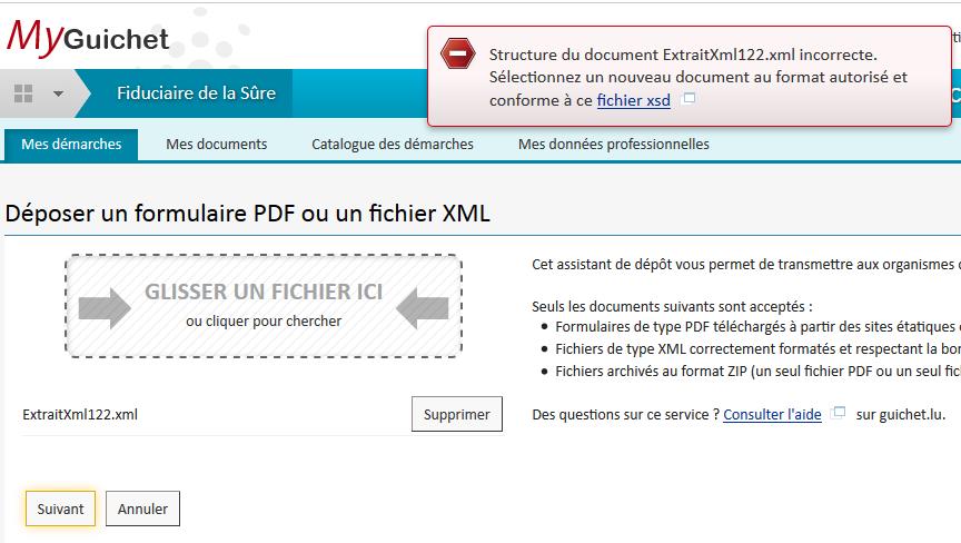 - Sur le Guichet, veuillez bien utiliser la démarche administrative "Déposez un document complété ... de type XML" pour déposer le fichier ZIP.